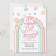 Six est une invitation d'anniversaire 6 ans inspirée de l'arc-en-ciel rétro avec des polices et des couleurs des années 70.