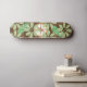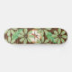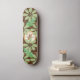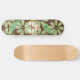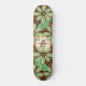 A estampa de folhas traz um elemento natural e orgânico ao design do skateboard. As folhas podem ser representadas de várias formas, desde padrões tropicais vibrantes até folhas mais sutis e estilizadas. Este tipo de estampa pode evocar uma sensação de liberdade e ligação com a natureza, tornando-se popular entre skatistas que apreciam o ar livre. O fundo em madeira escura, destaca o restante da estampa. Isso adiciona um toque rústico e clássico, contrastando de maneira elegante com as estampas de folhas.