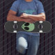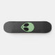 Tête alien verte simple avec grands yeux noirs et petite bouche noire sur un arrière - plan gris foncé.