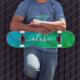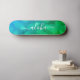 “Aloha”. Bring a bit of the Hawaiian islands to your city streets whenever you use this brightly colored, chic, striking, stylish, modern skateboard sporting crisp, white handwritten script typography over a distressed graphic, pineapple pattern in a vivid turquoise, blue and green ombre. Makes a fun and stylish statement every time you surf the pavement. Makes a great gift for a friend, or for yourself if you can’t bear to gift it away!
