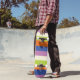 Des rayures inégales en bleu, orange, violet, vert et crème est un design classique mais moderne. Ce skateboard est parfait pour le printemps et l'été.