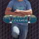 Cette parties scintillant colorée en bleu océanique et en or peut être offerte en cadeau pour célébrer un anniversaire, un anniversaire ou toute autre occasion. Il peut aussi être donné à une maman de skateboard pour la fête des mères. Le texte typographique du design est personnalisable et peut être personnalisé avec le nom d'une personne ou un message personnalisé. Vous pouvez modifier la police, la couleur de police, la taille de police et la couleur arrière - plan à l'aide de l'outil de conception.