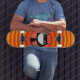 Chatte souriante avec arrière - plan orange funky. Patinage cool