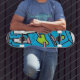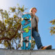Patinez dans le style avec un petit robot bleu triste à vos talons.