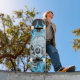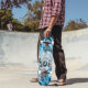 Le crâne drôle entouré par les flammes bleues est un crâne coloré qui semble grand sur des planches à roulettes.