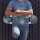 Planche à roulettes de denim - confortable et cassée dedans juste comme votre paire de jeans préférée. Une conception de patchwork de blue-jean empoche, des déchirures, trous et se fane.