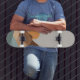 Un soleil désertique et des montagnes skateboard paysage, style boho. Terracotta, bisque et vert.