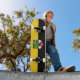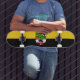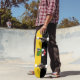 Skateboard avec drapeau de variante de Saxe-Anhalt; design avec deux bandes horizontales de jaune (or) et de noir, et avec armoiries de l’état au centre