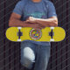 Planche à roulettes avec drapeau d'Honolulu, Hawaii; drapeau jaune avec accusé de sceau d'Honolulu