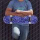 Un skateboard avec un design abstrait intéressant et diversifié, composé de formes circulaires de différents styles reliés par des lignes fines comme un réseau ou un écosystème.