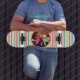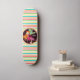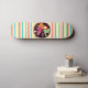 Fée mignonne, rose girly et violet avec ailes vertes assis sur un champignon sur bandes colorées arc-en-ciel, rouge, orange, jaune, vert, aqua motif turquoise.