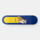 Ce skateboard amoureux des chiens présente l'illustration d'un bulldog anglais dressé contre un arrière - plan bleu royal et jaune vif et prêt à être personnalisé avec un nom ou un autre texte en lettres bleues royales.