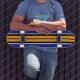 Ce design cool et sportif présente une bande verticale de centre jaune doré, scindée par une fine rayure noire, puis assortie de rayures et de rayures blanches. La bande la plus externe de chaque côté est bleue royale.