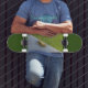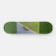 Un Skateboard vert foncé 7 3/4, avec une photo d'un Grasshopper, sur une balustrade.