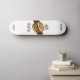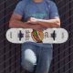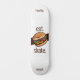 Logo burger kawaii sur fond blanc avec texte eat. skate. repeat. et son bandeau marron
