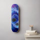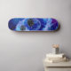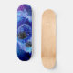 traditional watercolor design featuring a blue and purple colored planet in a blue and purple galaxy wited flying saucers in cube closing in on a a skateboard