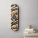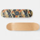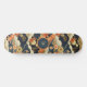 This vintage look skateboard features a Japanese style print -- similar to a kimono pattern -- with white, teal, tan, and orange flowers on dark teal-- almost black. Your monogram initial appears in gold text on a coordinated circle of dark blue teal, bordered by orange. The combination of clouds, graphical lines, stylized flowers, and curved pattern create a peaceful and beautiful aesthetic.