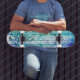 Patinage de marque Dd, avec dessin graphique de style grunge, bois coloré bleu et vert avec des pochoirs fleuris. Customisez d'ajouter votre propre texte.
