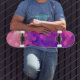 Design abstrait en mosaïque moderne motif avec beaucoup d'éléments géométriques ornementaux dans les couleurs rose et violet sur un skateboard