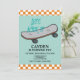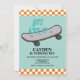 Skateboard Let's Kick It, invitation d'anniversaire avec chèque noir et skateboard bleu.