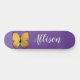 Bouton jaune mou Girly Purple Papillon Personnalisé skateboard. Le design a été créé à partir d'une photo personnelle d'un vrai papillon avec un filtre ajouté. L'arrière - plan est violet comme le montre la photo et le grand papillon est sur la zone gauche suivi par le nom en caractères de script de calligraphie blanche.