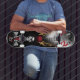 Conception de planche à roulettes avec le crâne et la couronne à l'envers, les flammes, les flèches et les petits chiffres faisants de la planche à roulettes. Lit également le "patin de baril" avec le logo des BS.