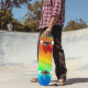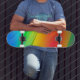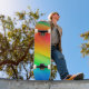 Ce skateboard de qualité est présenté avec un imprimé motif d'art abstrait dans un effet arc-en-ciel de couleurs bleu, vert, orange et rouge. Acheter tel quel ou customiser cet objet à votre goût. Image stock 123freevectors.com