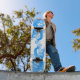 Skateboard illustré dans une impression graphique d'onde couleur bleue. Couleurs Bleu et Blanc Acheter tel quel ou customiser cet article à votre goût. Image stock