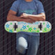 Préparez-vous à descendre dans la rue avec élégance avec ce skateboard unique qui présente un design coloré de peinture vert néon et bleu ciel. Décoré d'étoiles et de l'audacieuse mention "Grind Time", ce skateboard est un must-have pour tout patineur qui cherche à faire une déclaration. Que vous soyez en train de parcourir les rues ou d'atteindre le skate park, ce skateboard est sûr de tourner les têtes et de présenter votre style unique. Ne ratez pas votre chance d'attraper ce tableau accrocheur et de montrer vos compétences en style!