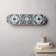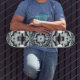 Un motif géométrique noir, gris et bleu complexe orne cette carte cool.