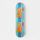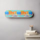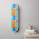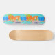 Entrez ! L'eau est correcte ! Retro Pool Party Skateboard présente un dessin animé reprenant et animé d'une fête de billard amusante et sophistiquée. Le design moderne du milieu du siècle s'articule autour d'une piscine ronde sur un grand patio gris en béton. La piscine est remplie d'eau turquoise. Des briques orange entourent la piscine et il y a un plongeoir blanc à planches prêt pour une âme aventureuse. Une balle de plage rouge et blanche flotte dans l'eau. De l'autre côté de la piscine, deux fêtards se baladent les pieds dans l'eau, allongés sur des serviettes de plage rayées rouges et blanches. La femme aux cheveux noirs porte un maillot de bain rose et une pièce. A côté d'elle, une boisson tropicale dans une noix de coco avec un petit parapluie et une paille verte. L'homme blond porte des troncs verts et lumineux. On lui donne un coup de pied avec les mains derrière la tête. À gauche de la piscine, se trouve un homme distingué aux cheveux blancs et aux maillots de bain en jade qui tient un verre en coquille de coco. Nous savons qu'il est distingué parce qu'il est un homme aux cheveux blancs ! Il s'adresse à une femme aux cheveux blonds et à une figure en sablier en maillot de bain turquoise. Le poumon sur son bras est une serviette de plage jaune> Derrière cette scène se trouve la silhouette verte d'un palmier et d'une maison futuriste en brique orange. Par les grandes baies vitrées bleues, on aperçoit la silhouette d'une télévision, d'une chaise, d'un ottoman et d'une starburst clock. Le ciel derrière la maison est un turquoise sans nuages avec un soleil rond et jaune.