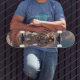 La patineta tiene un diseño temático relacionado con un astronauta y un entorno extraterrestre. En otras palabras, la tabla de la patineta presenta ilustraciones que representan a un astronauta y un paisaje alienígena en su superficie. Esta temática sugiere la fusión de elementos espaciales y extraterrestres en el diseño de la patineta, lo que brinda un aspecto único y futurista a este medio de transporte recreativo.