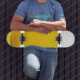 Plate-forme de planche à roulettes avec une image étroite haute d'une pinte de bière là-dessus.