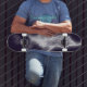 Plate-forme de planche à roulettes avec la foudre sur le fond.