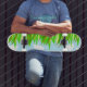 Cette planche à roulettes présente une belle illustration d'herbe et de ciel bleu. C'est parfait pour quiconque aime patiner quand le temps est juste parfait.