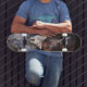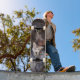 Grand vieux chien et jeune chaton sont des copains à chevaucher sur votre skateboard!