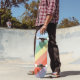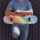 Un skateboard avec des rayures arc-en-ciel pastel en diagonale : une idée cadeau pour un ami qui aime les couleurs !