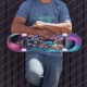Ce design animé est doté d'un DJ en chat cool au coeur d'une soirée sur le toit, sur fond d'une ligne d'horizon de la ville la nuit. Portant un casque et mélangeant avec confiance les beats, le chat incarne la fusion de la vie nocturne urbaine et du cool décontracté qui définit "La collection de chats Cool". Lumières colorées, figures dansantes et touches de néon donnent vie à l'ambiance festive animée, faisant de ce skateboard un must pour les amateurs de musique, les amateurs de skateboard et les amateurs de chat.