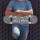 Cette planche à roulettes est couverte de tuiles avec des dessins de crâne de sucre et un rappel pour porter un casque en texte d'amusement.