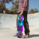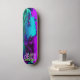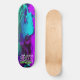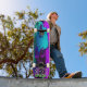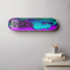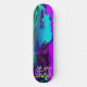"ARKN : softcorp" : Etché en turquoise électrique, le texte cryptique à la base du tableau attire les âmes curieuses. S'agit-il d'une société? Un ordre clandestin ? Ou peut-être les deux, un collectif clandestin qui se promène dans les rêves et la métamorphose. Les lettres se tordent, se retournent, une énigme pour ceux qui osent monter. Roues de demain : Les roues - à rime néon, silencieuses - tournent comme les engrenages oubliés du temps. Ils portent le poids d'innombrables voyages : des ruelles aux sanctuaires sur le toit, de la réalité aux royaumes augmentés. Chaque révolution promet une transformation, une chance de se libérer ou d'être consommé. Le Voile Violet : Le tablier du skateboard, une toile violette de minuit, capte l’essence d’un millier de rêves virtuels. Il glisse avec de l'iridescence, comme si tissé à partir de la poussière d'étoile et du code rayé. La couleur elle-même murmure des souvenirs oubliés et des réalités fracturées. En son coeur, un personnage d'anime émerge, une fusion d'humains et de machines. Leurs cheveux émeraude défient la gravité, une comète verdoyante qui s'étend sur toute la surface. Les yeux, lumineux et énigmatiques, détiennent des secrets qui pourraient réécrire les destins. Leurs membres cybernétiques portent des cicatrices de batailles livrées dans des royaumes au-delà de l'écran.