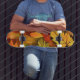 La patineta presenta un diseño visualmente atractivo inspirado en hojas otoñales llamativas. La patineta exhibe ilustraciones o patrones que capturan la esencia y los colores característicos de las hojas que cambian de color durante la temporada de otoño. Este diseño incluye tonalidades cálidas como rojos, naranjas y marrones, típicas de las hojas en otoño. La intención es proporcionar un toque estético y artístico a la patineta, haciéndola única y destacando la belleza de la naturaleza en esa estación específica.