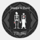 Skeleton Couple Enregistrer le Étiquette Date Sticker. Une grande paire de squelettes qui représentent la mariée et le marié, tenant le coeur rouge au sommet d'un arrière - plan florissant.