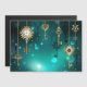 Or, clés antiques avec engrenages et cadrans accrochés sur chaînes dorées sur arrière - plan vert lumineux.