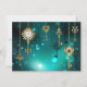 Or, clés antiques avec engrenages et cadrans accrochés sur chaînes dorées sur arrière - plan vert lumineux.