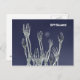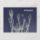 Cette carte postale d'Halloween présente des squelettes avec leurs mains dans l'air.