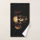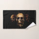 Three human skulls against a back drop of black. A little critter peeking out form the middle skull.