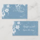 Le texte sur ces élégantes cartes à fleurs vintage bleu clair ou bleu ciel et blanc mariage ou lieu d'événement spécial ou d'escorte est entièrement personnalisable, ou simplement laisser comme il est. La taille de la carte est de 3,5" x 2" et tout ce qui est nécessaire sont des porte-cartes ou juste une table pour les afficher. Cette carte florale sophistiquée fonctionnera bien pour une variété d'occasions spéciales, y compris des mariages, des fêtes d'anniversaire, des fêtes d'anniversaire, etc. Le bleu et le blanc élégant convient bien à un mariage au printemps, en été ou en hiver. Le floral a une allure vintage.