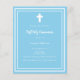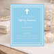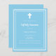 Un arrière - plan bleu ciel, décoré d'un cadre blanc, et d'une croix blanche Personnalisez et ajoutez le nom et les détails. Texte blanc. 1 feuille = 1 invite imprimé bord à bord.