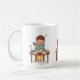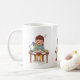 Adorable cartoon illustration of a child studying and dozing off, shown in three stages in one continuous scene. Left: child sitting upright at a desk with pencil and coffee cup, slightly sleepy. Middle: child leaning on the desk, eyes lightly closed, soft ‘zzz’ bubbles floating above. Right: child fully asleep, coffee cup tipped slightly, cozy blanket and stack of books nearby. Warm pastel colors, playful and whimsical style, perfect for Children’s Day mugs, coffee table décor, or kids’ themed gifts. Fun, cheerful, and child-friendly illustration suitable for prints and merchandise