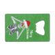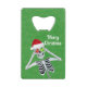 Cet ouvre-bouteille de carte de crédit qui s'intègre dans votre porte-monnaie a un squelette souriant portant un casquette du Père Noël rouge tenant des ornements brillants à ses yeux sur un arrière - plan vert avec de minuscules éclats d'or. Customisez le texte Joyeux Noël avec le modèle.